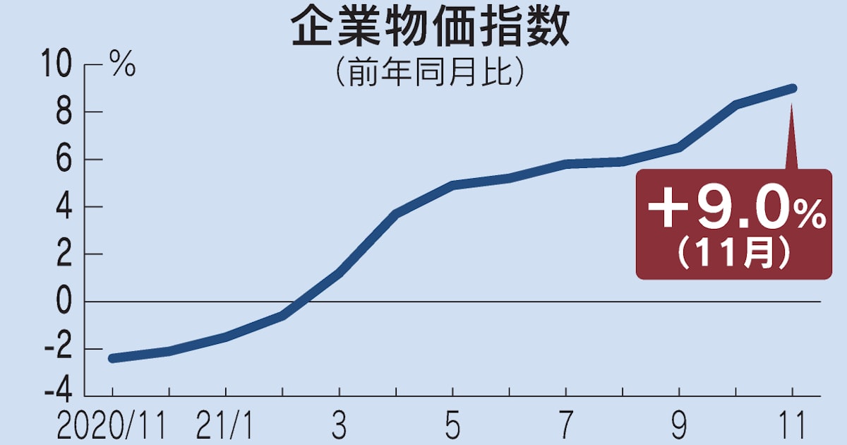 11月の企業物価指数は前年同月比9.0%上昇しています。